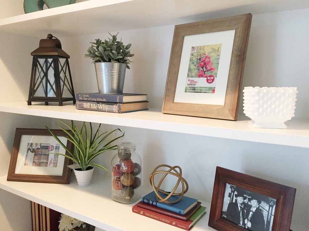 Depending on their size you can layer them in front of books, or lean them against the back of the shelf and layer smaller items in front.
